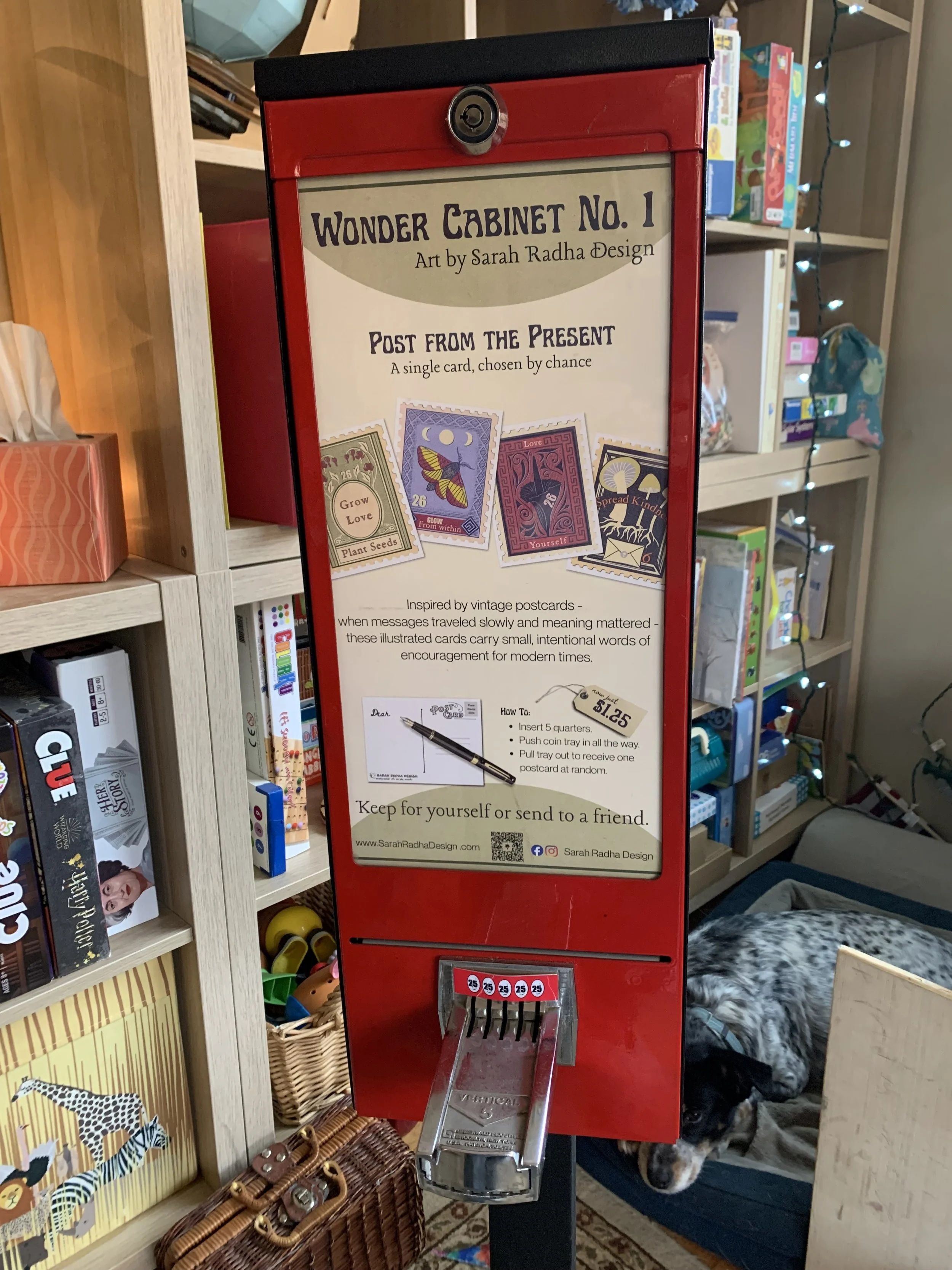Rather than choosing a specific design, visitors insert $1.25 and receive one postcard at random. The element of chance is intentional: you don’t pick the message—you receive the one that finds you.